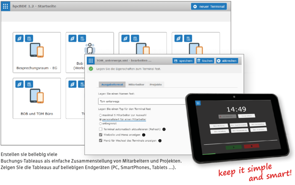 Mit dem Android Tablet bringen sie die hpcBDE Projetzeiterfassung genau an den Arbeitsplatz. Das wandmontagefähige 8 Zoll Touch Tablet wird bereits mit einem Full Screen Browser vorkonfiguriert ausgeliefert, so dass die Ausgabe-Website der hpcBDE Projektzeiterfassung automatisch starten kann.